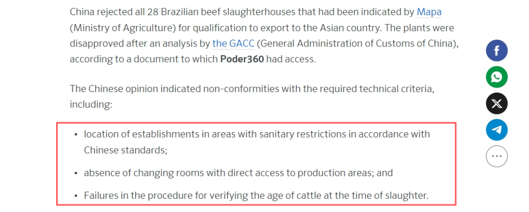 海关总署建议巴西采取必要的更正措施,并通过 Cifer 系统(对华食品出口公司注册)重新提交企业材料。 本次审查未通过的仅限于牛肉屠宰场,名单中所包含的家禽、猪肉和驴肉,并未在声明中所提及。
